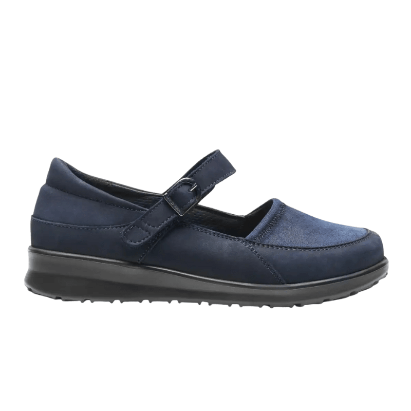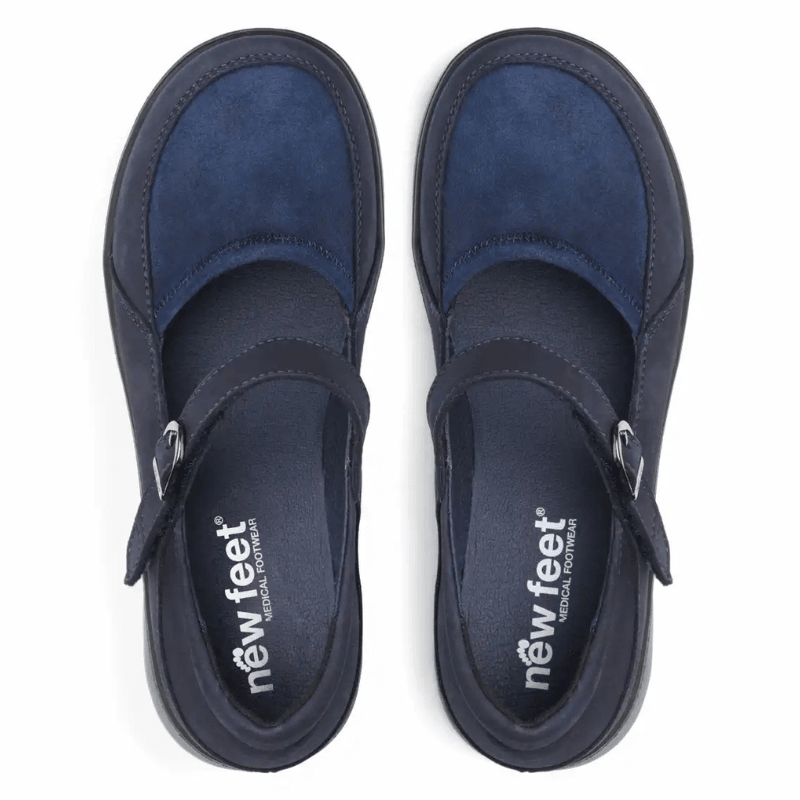 Bailarina New Feet azul escura em couro macio e natural com detalhes em camurça, projetada para proporcionar conforto durante todo o dia. O sapato possui um sistema de fecho inteligente com uma única tira de velcro sobre o peito do pé, que pode ser facilmente ajustada para uma adaptação ótima.