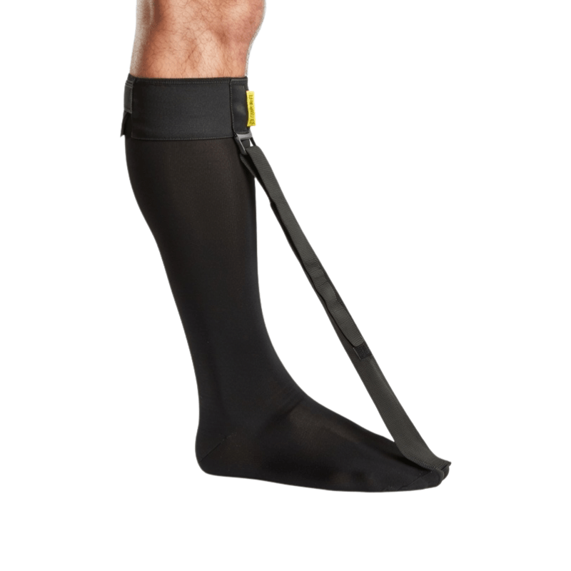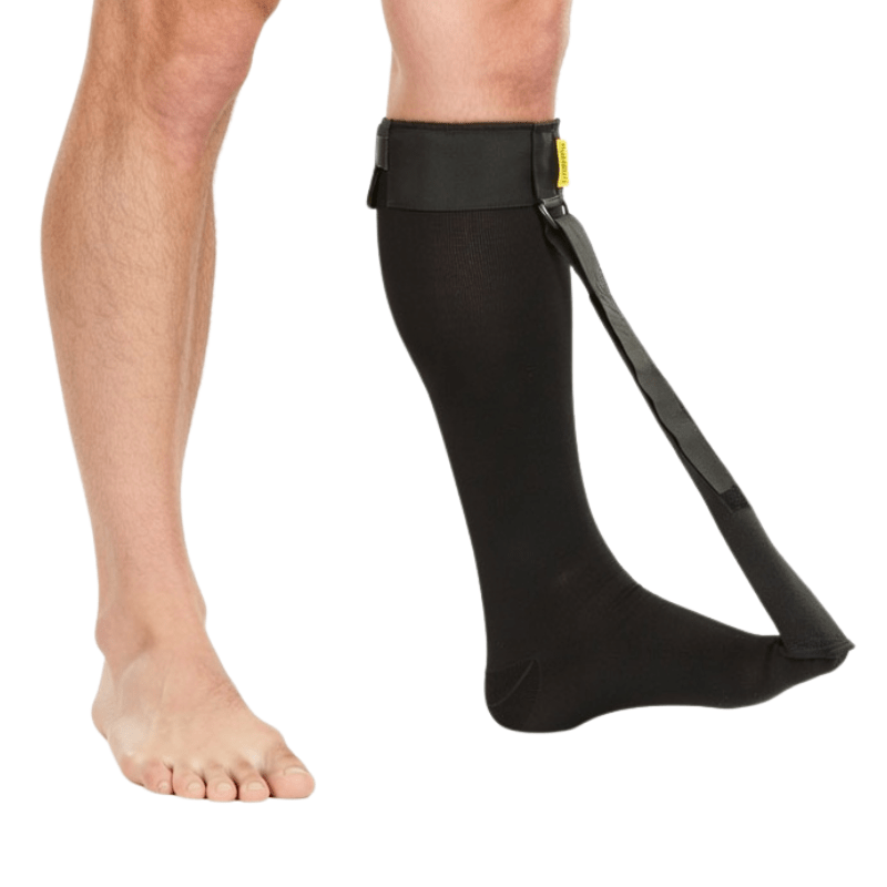 Smidig sort Strassburg strømpe, der anvendes om natten til behandling af inflammation i senetilhæftningen eller hælspore. Strømpen virker ved at strække plantarfascian, som bevarer den opheling, der sker i løbet af natten.