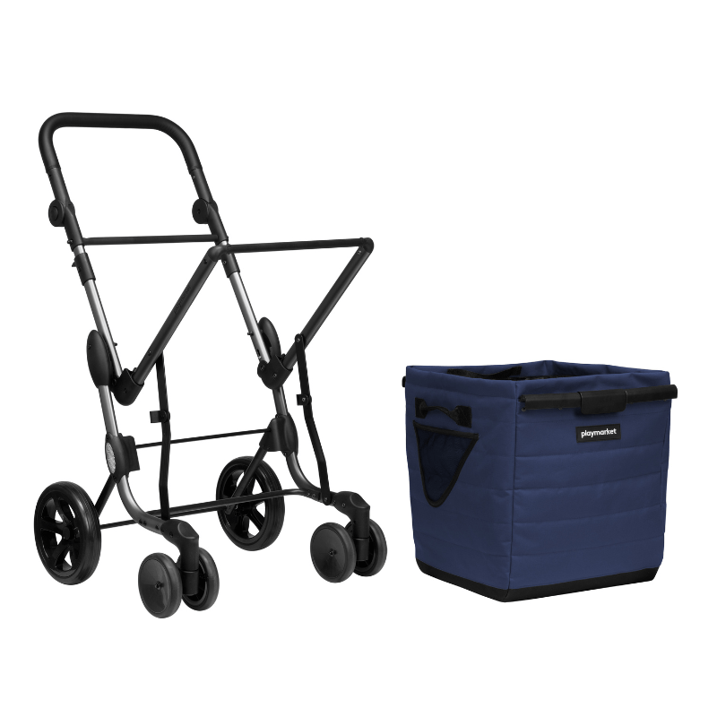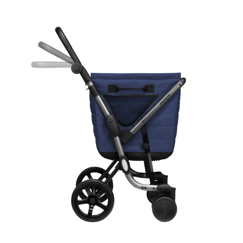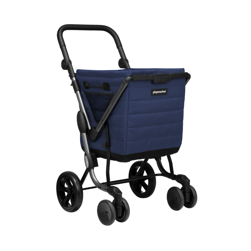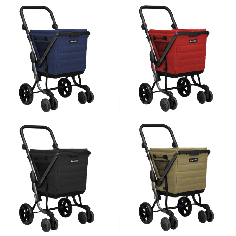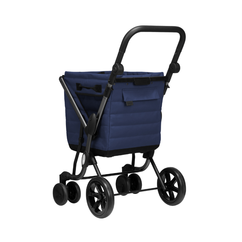 Indkøbsvognen har en stor rummelig tekstilkurv, som er produceret i et stærkt vandtæt materiale. På denne nye model er det blevet nemmere at (af)montere tasken på stellet, og inderposen kan tages af og vaskes.