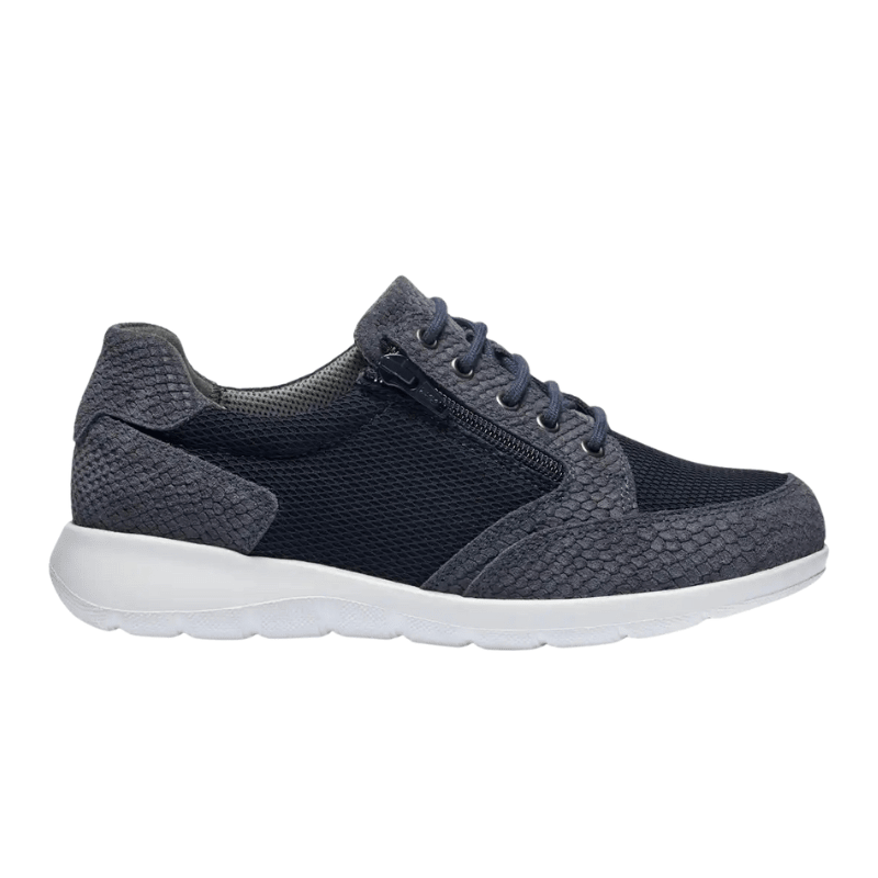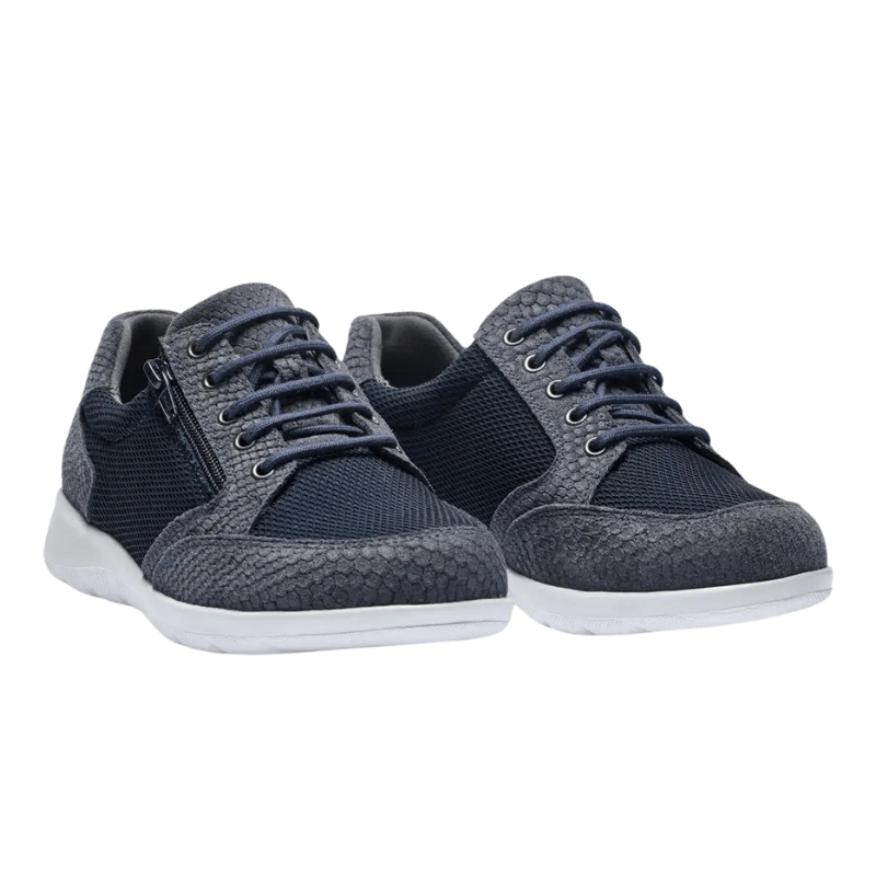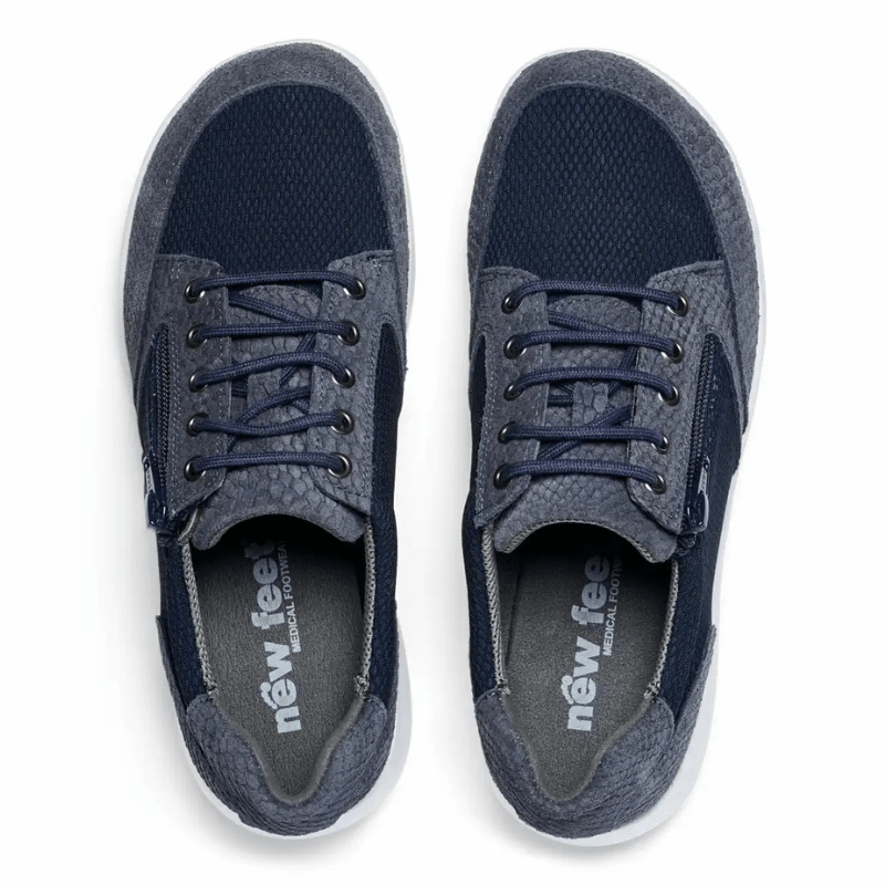 Elegant mørkeblå sneaker fra New Feet i en blanding af ruskind og tekstil med flotte slangeskindslignende detaljer. Skoen har både snørebånd og lynlås, så den er nem at tage af og på og justere i pasformen.