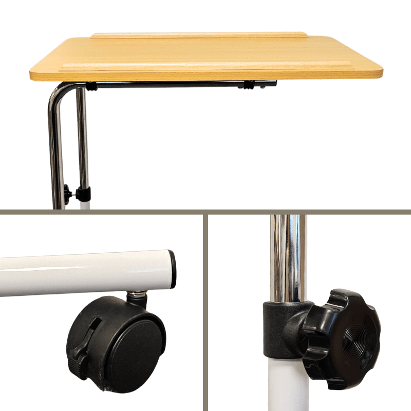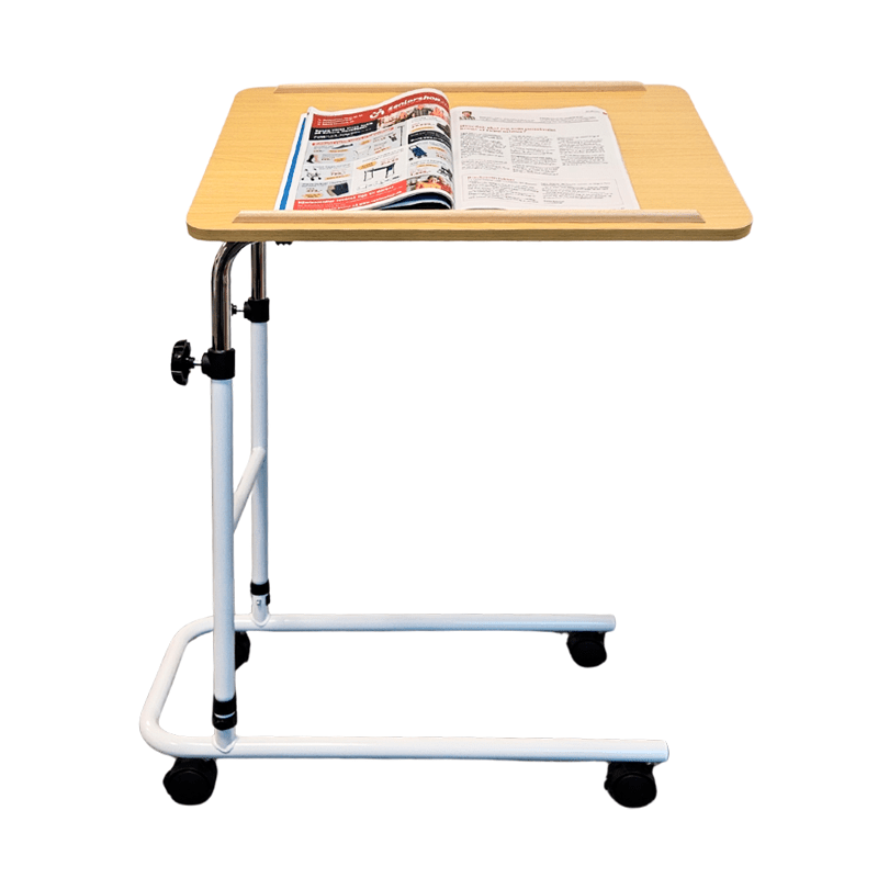 Dette praktiske sengebord er designet til at passe perfekt omkring møbler som seng, stol eller kørestol. Det giver dig en fleksibel og komfortabel løsning, uanset hvor du ønsker at bruge det.