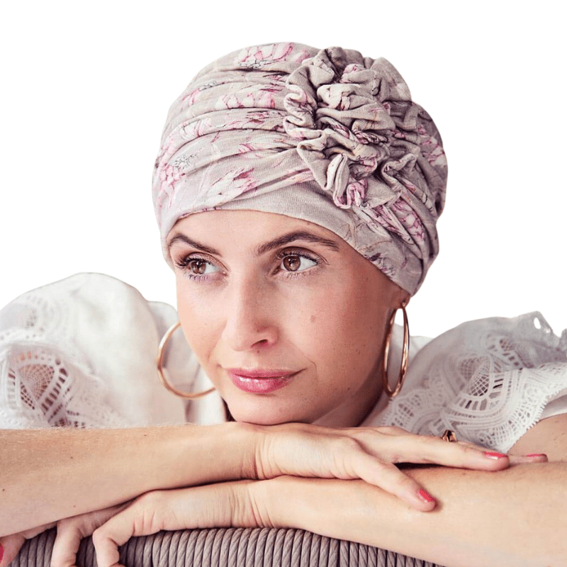 Elegant turban med blomsterdetalje