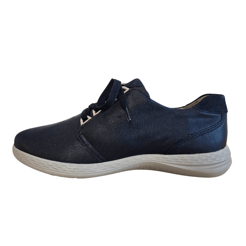 Ténis Fidelio azul-escuro com parte superior em couro e multi-stretch, proporcionando conforto, durabilidade e flexibilidade ótimos. O calçado possui atacadores e fecho de correr lateral, sendo ideal para uso diário.