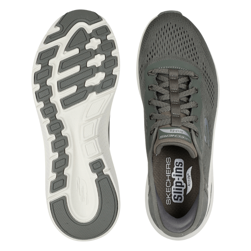 Sneaker feminina slip-in flexível e leve da Skechers em tecido verde-oliva com membrana impermeável e tecnologia Arch Fit, que oferece suporte direcionado para o arco.